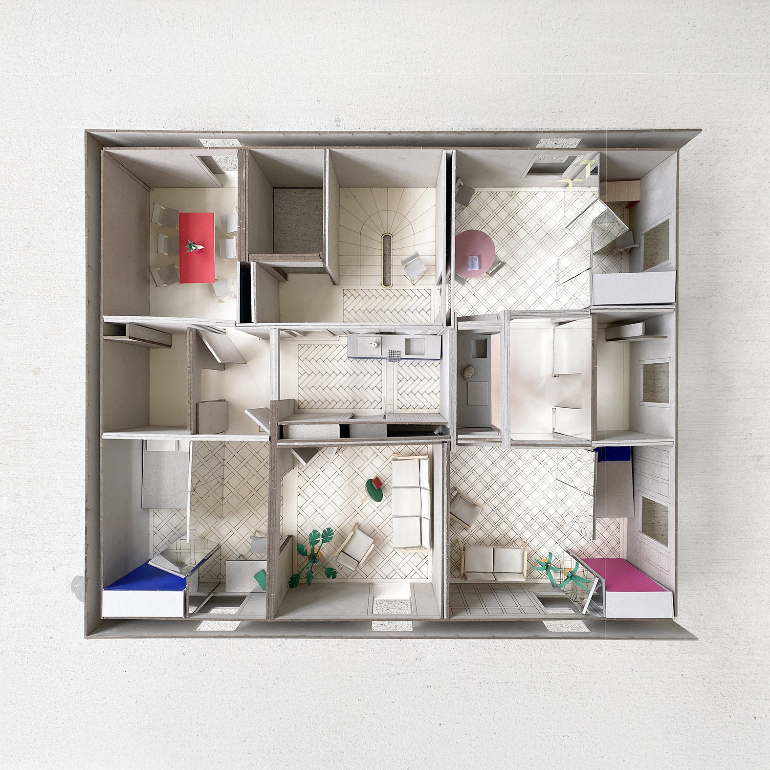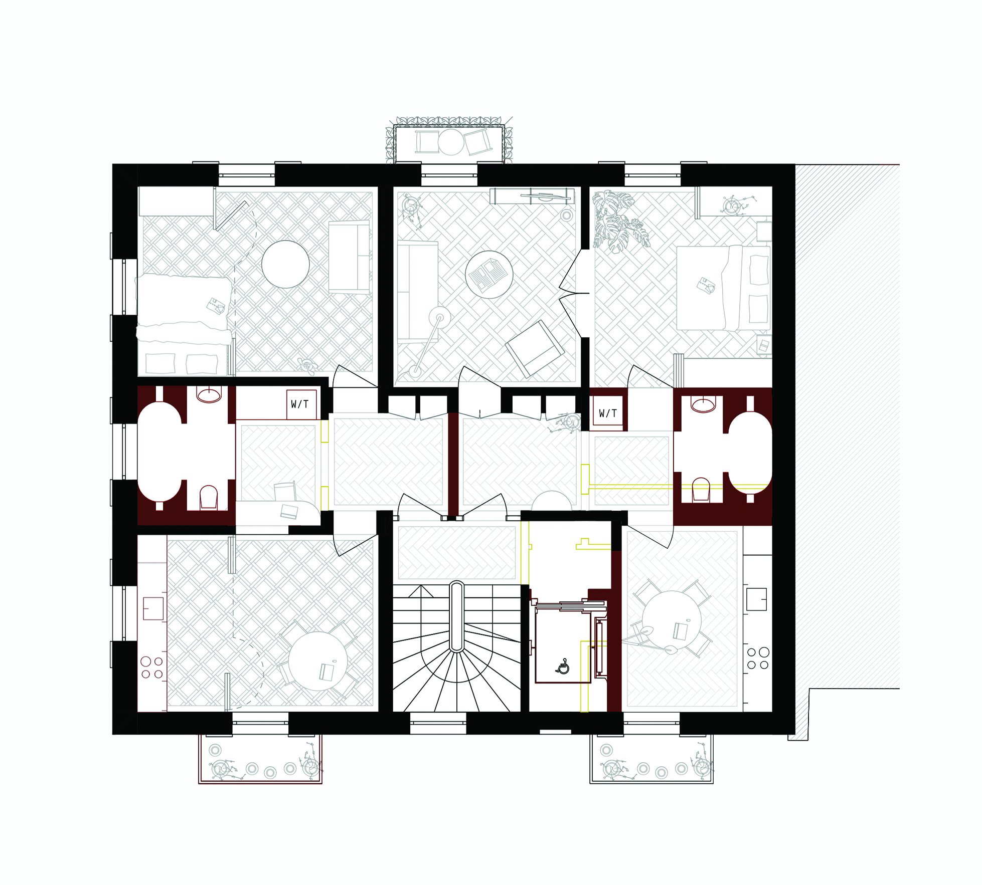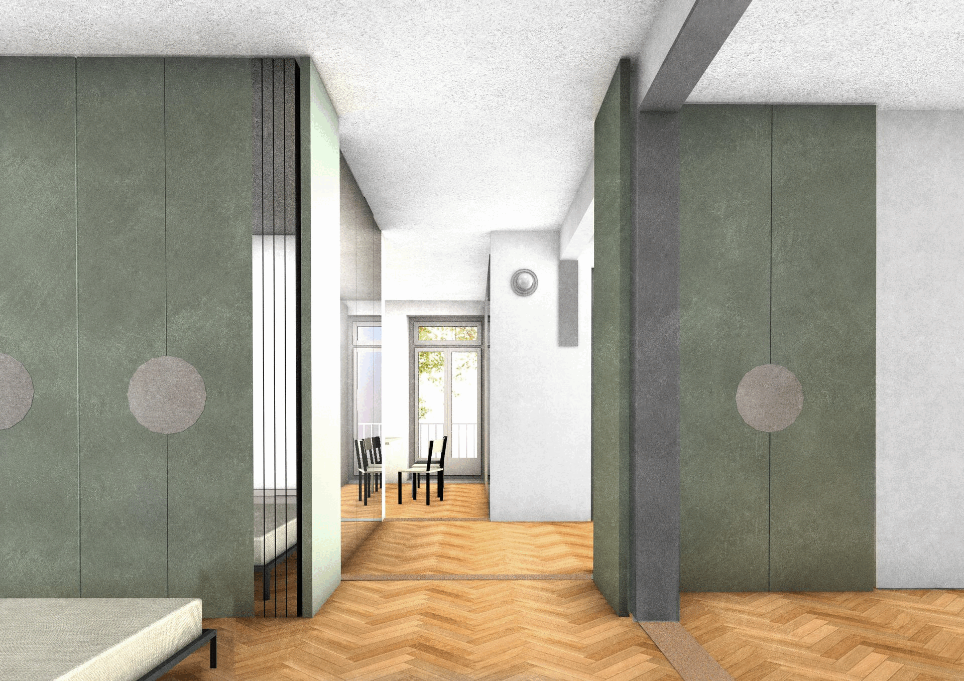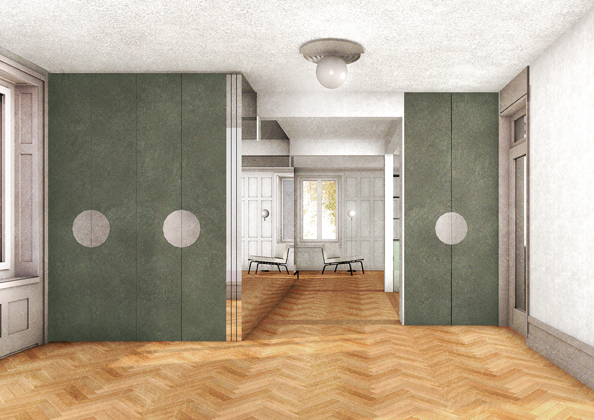 Die bestehenden Wohnungen zeichnen sich durch ihren charakteristischen Altbaucharme aus. Dieser wird durch die kammerartige Zimmertypologie mit jahrhundertealten Vertäfelungen, Deckenstuckaturen, die verglasten Eingangsfronten und Einbauten sowie durch die gut erhaltenen Fischgrat-, Flecht- und Kasettenholzböden geprägt. Durch die Erschliessung aller Zimmer über einen zentralen Vorraum und weiteren Verbindungstüren untereinander, wird eine hohe Nutzungsneutralität und - flexibilität gewährleistet. Mit den geplanten Eingriffen soll diese Anpassungsfähigkeit erhalten bleiben. Durch die Unterteilung entstehen auf dem Regelgeschoss aus den 5.0 Zi-Wohnungen jeweils zwei kompakte 4.0-Zonen-Wohnungen. Während die Küchen und Nasszellen in die Mittelzone der Wohnungen geschoben werden, bleiben die verbleibenden teils zweiseitig belichteten Zimmer weiterhin nutzungsneutral. Um die Belegungsdichte und Zonierbarkeit der Wohnungen zu optimieren, sorgen verspiegelte Falt-/Drehwände für eine flexible Nutzungsüberlagerung der jeweiligen Zimmer. Durch die Verspiegelung vermögen diese Elemente abstrakt und neutral in Erscheinung zu treten, um den künftigen Bewohnern maximale Freiheit in der individuellen Möblierung der Wohnungen zu ermöglichen. Gleichzeitig setzen sie einen kontrastreichen Akzent zum klassischen Altbau Repertoire und vermitteln ein grosszügiges Raumerlebnis.