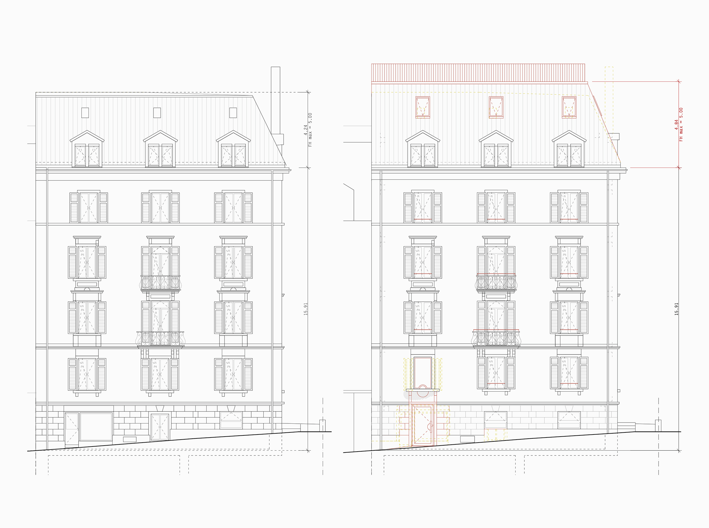 Neben Sicherheitsmassnahmen an den Fenstern und Absturzsicherungen, sowie strukturellen Eingriffen zur Unterteilung und Optimierung der Wohnungsgrundrisse wird eine sanfte Sanierung der Fassade angestrebt sowie Massnahmen zur Schallertüchtigung der Decken und Wohnungstrennwänden. Ebenfalls wird der Ersatz der Fenster, der Heizung mit Einbau einer Bodenheizung und eine Dämmung des Zinnen- und Mansardendaches vorgesehen. Die Elektroinstallationen und auch die Küchen und Nasszellen werden komplett ersetzt.